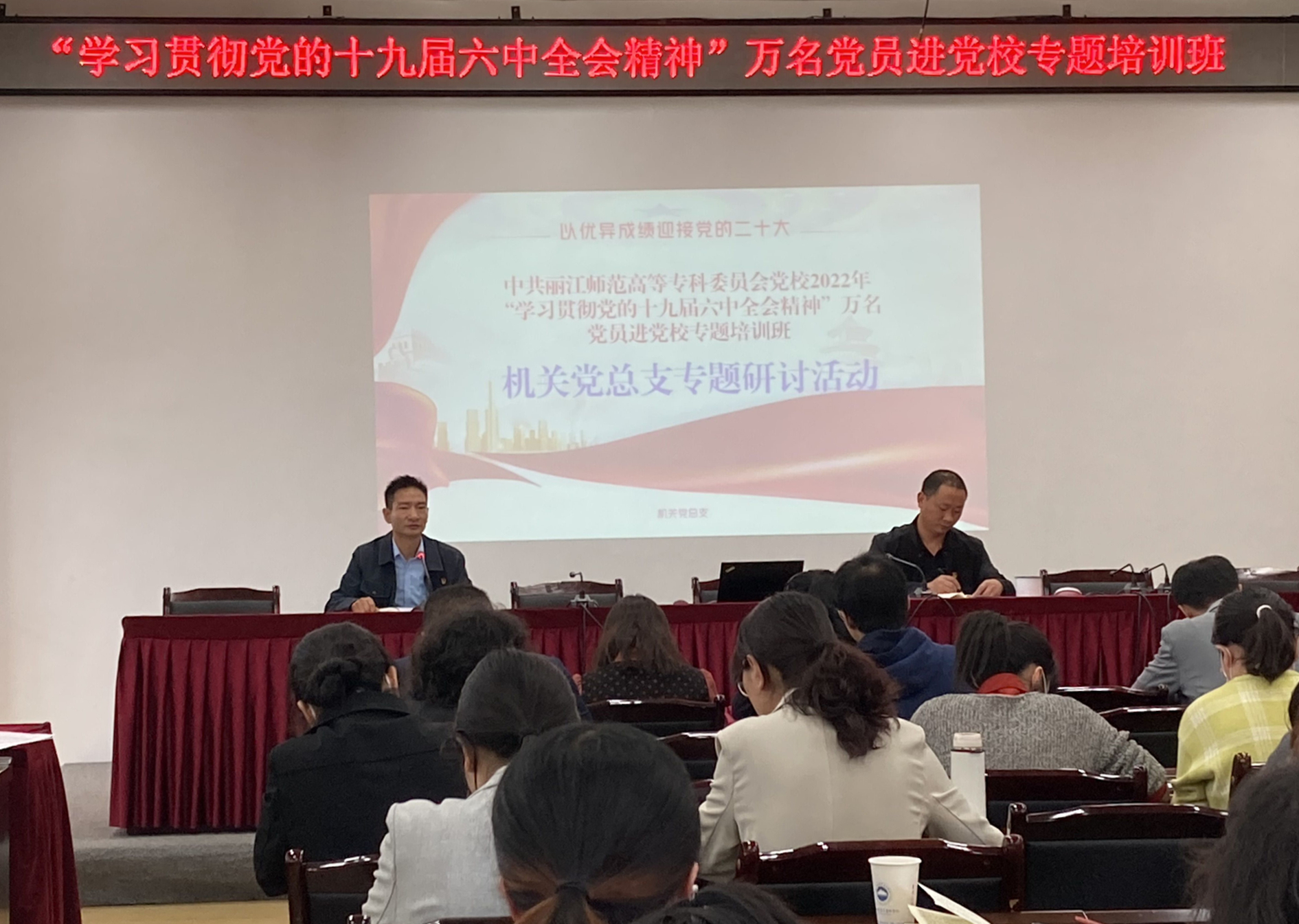 2022年4月28日上午8:30,机关党总支分两个会场召开“党员在疫情防控中的先锋模范作用”专题研讨会,机关党总支下属各党支部、全体党员参加研讨会。研讨活动属于中共丽江师范高等专科委员会党校2022年“学习贯彻党的十九届六中全会精神”万名党员进党校专题培训班的学习任务之一。两个分会场分别由党委委员、组织部长和新梅同志、统战部副部长、机关党总支书记徐安绕主持。