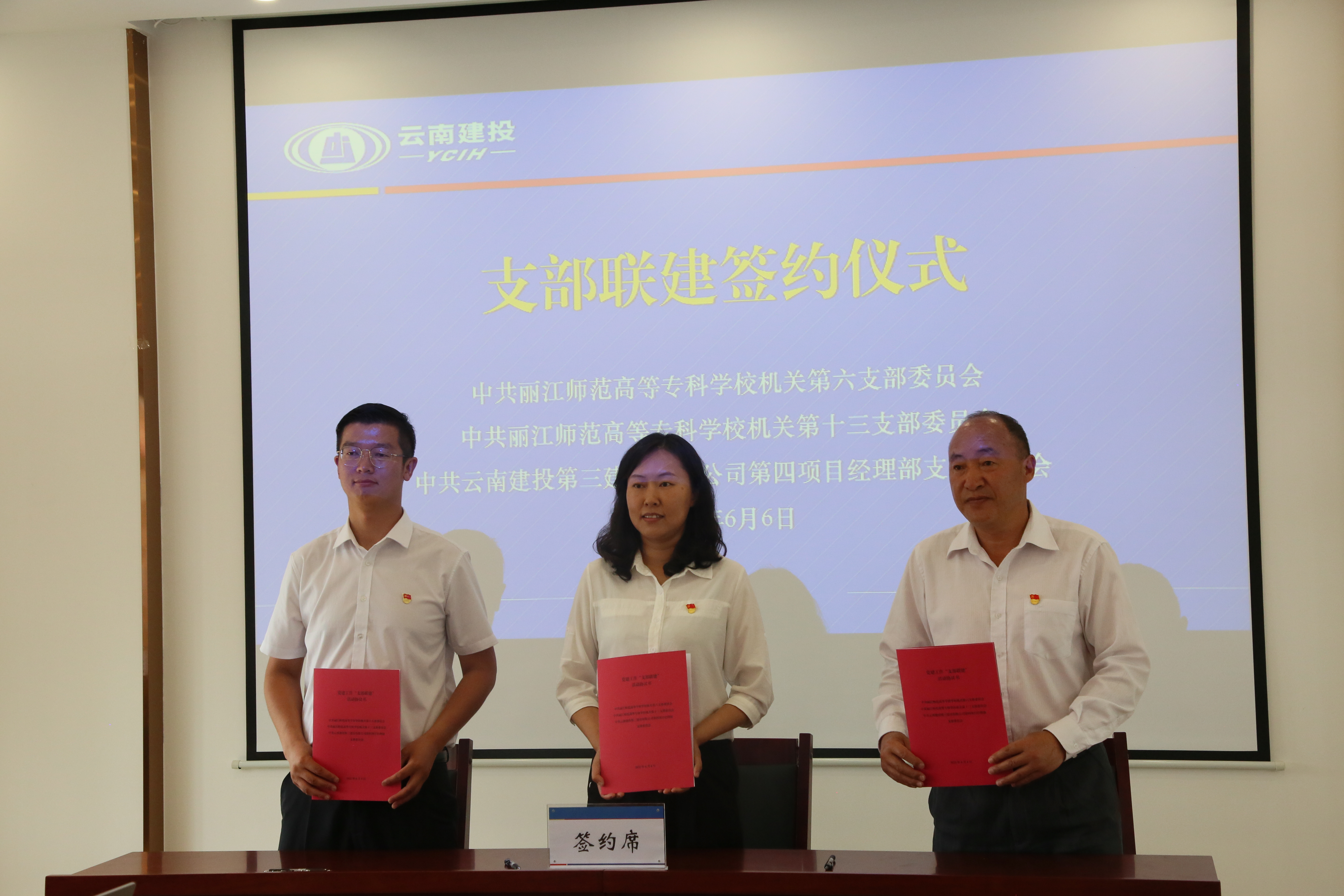 党支部联建签约仪式暨主题党日活动在云南建投三公司丽江师专项目部会议室举行,云南建投三公司党委书记、董事长彭云,党委委员、副总经理(主持经理层工作)李骞,党委委员、纪委书记付献智,丽江师专党委书记张祖武,党委副书记、校长毕天云,副校长张兰胜以及学校机关党总支第六党支部、第十三党支部和建投三公司第四项目经理部党支部所属党员参加活动。