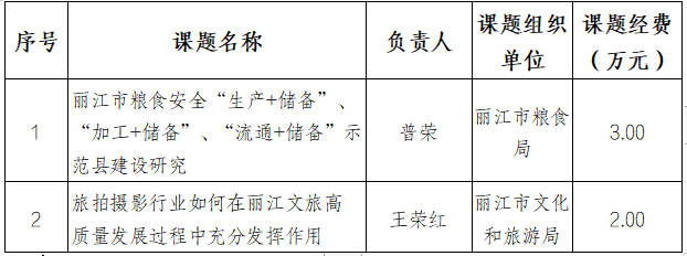 近日,收到丽江市人民政府发展研究中心《课题立项通知书》,我校共计立项2项(具体立项名单见下表),其中,机关党总支普荣同志的《丽江市粮食安全“生产+储备”“加工+储备”“流通+储备”示范县建设研究》获得立项。