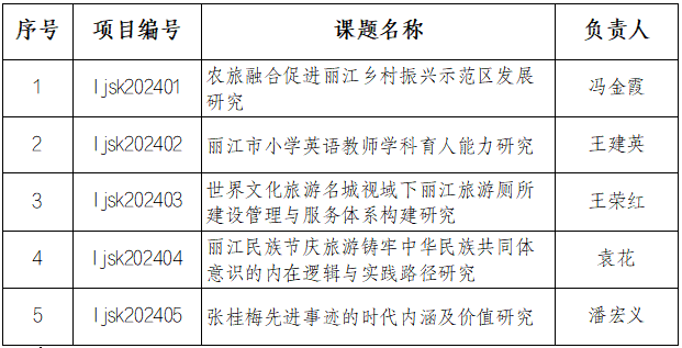 近日,收到丽江市社会科学界联合会文件《2024年度丽江市哲学社会科学课题立项的通知》,我校共计立项5项(具体立项名单见下表),机关党总支的袁花同志、潘宏义同志各获1项立项。